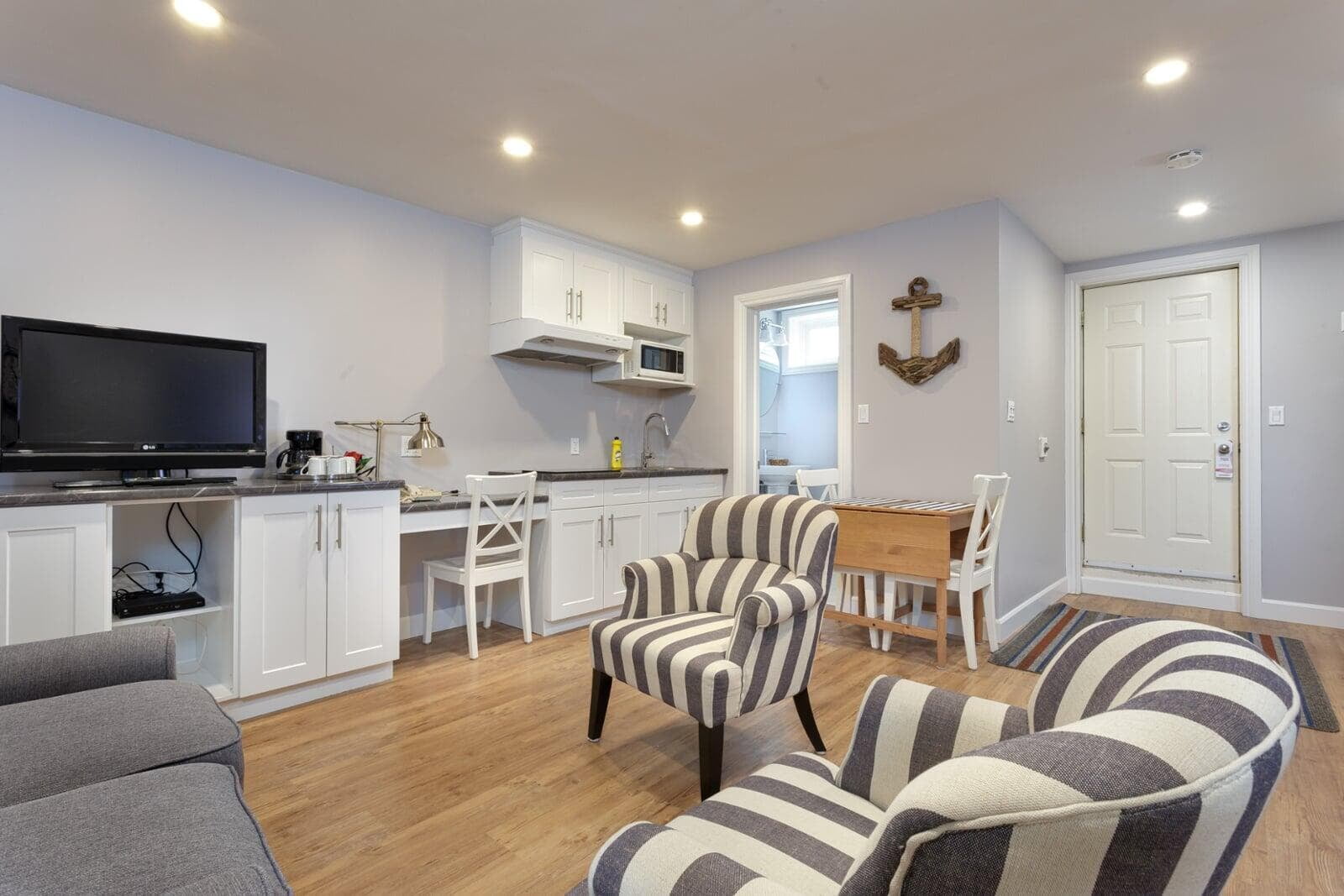 This fully renovated two-bedroom suite features two separate bedrooms, each with a queen bed.
